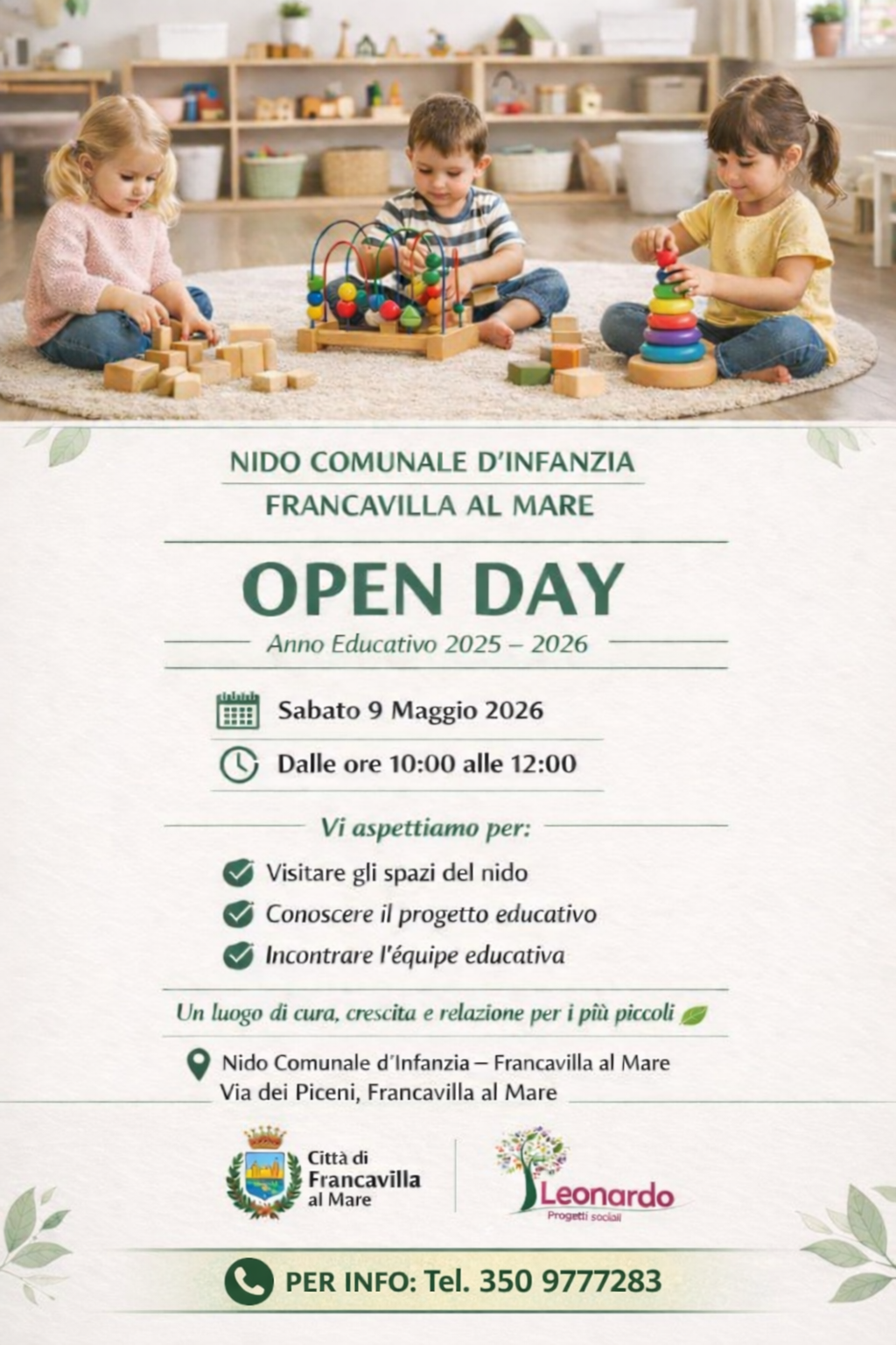 Sabato 9 Maggio 2026 dalle ore 10:00 alle ore 12:00 sarà possibile visitare il nido Comunale d'infanzia sito in Via dei Piceni, per conoscere meglio la struttura, il progetto educativo e l'equipe.